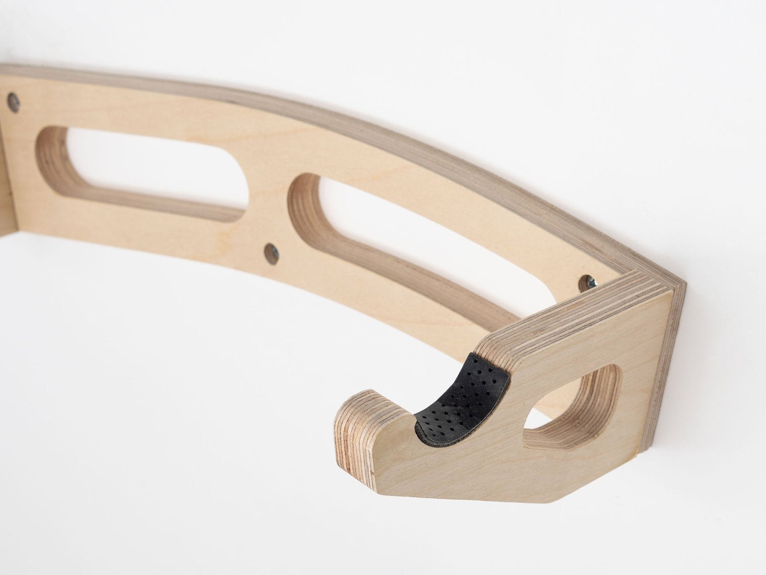 Fabricado en madera contrachapada de alta calidad y diseñado cuidando cada detalle. Con una cinta de manillar para la zona de cojntact con el cuadro y no marcar la bicicleta.