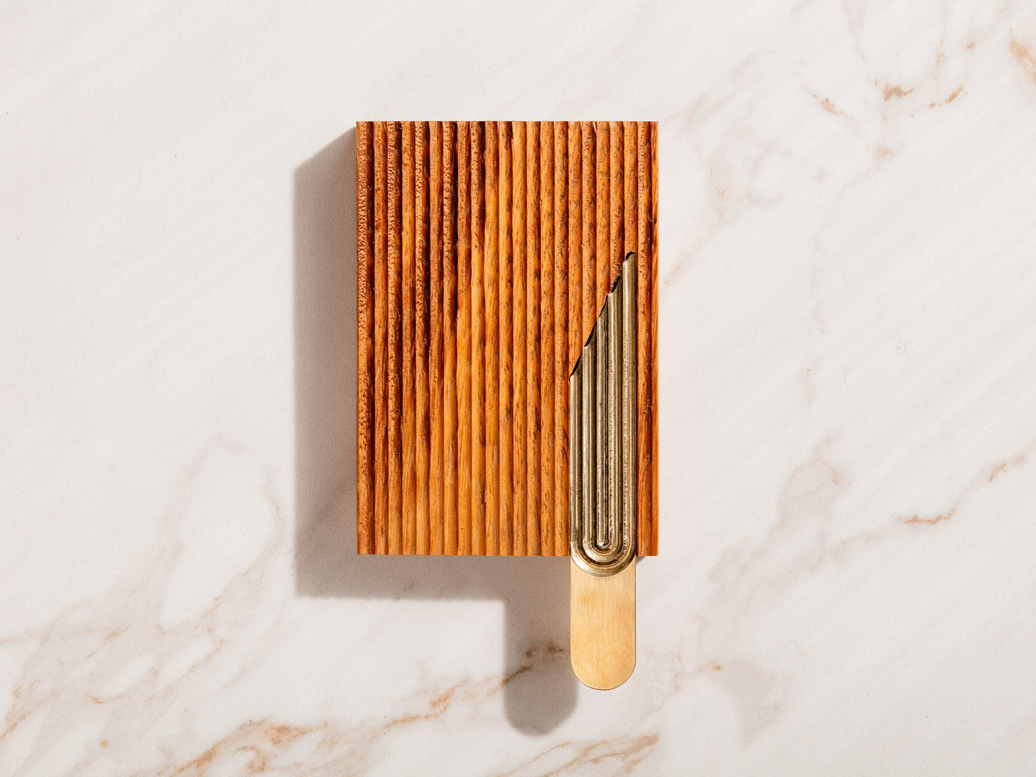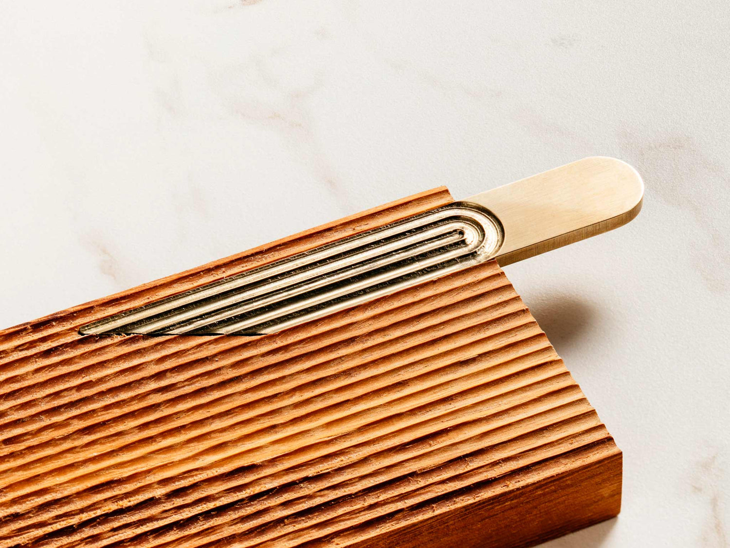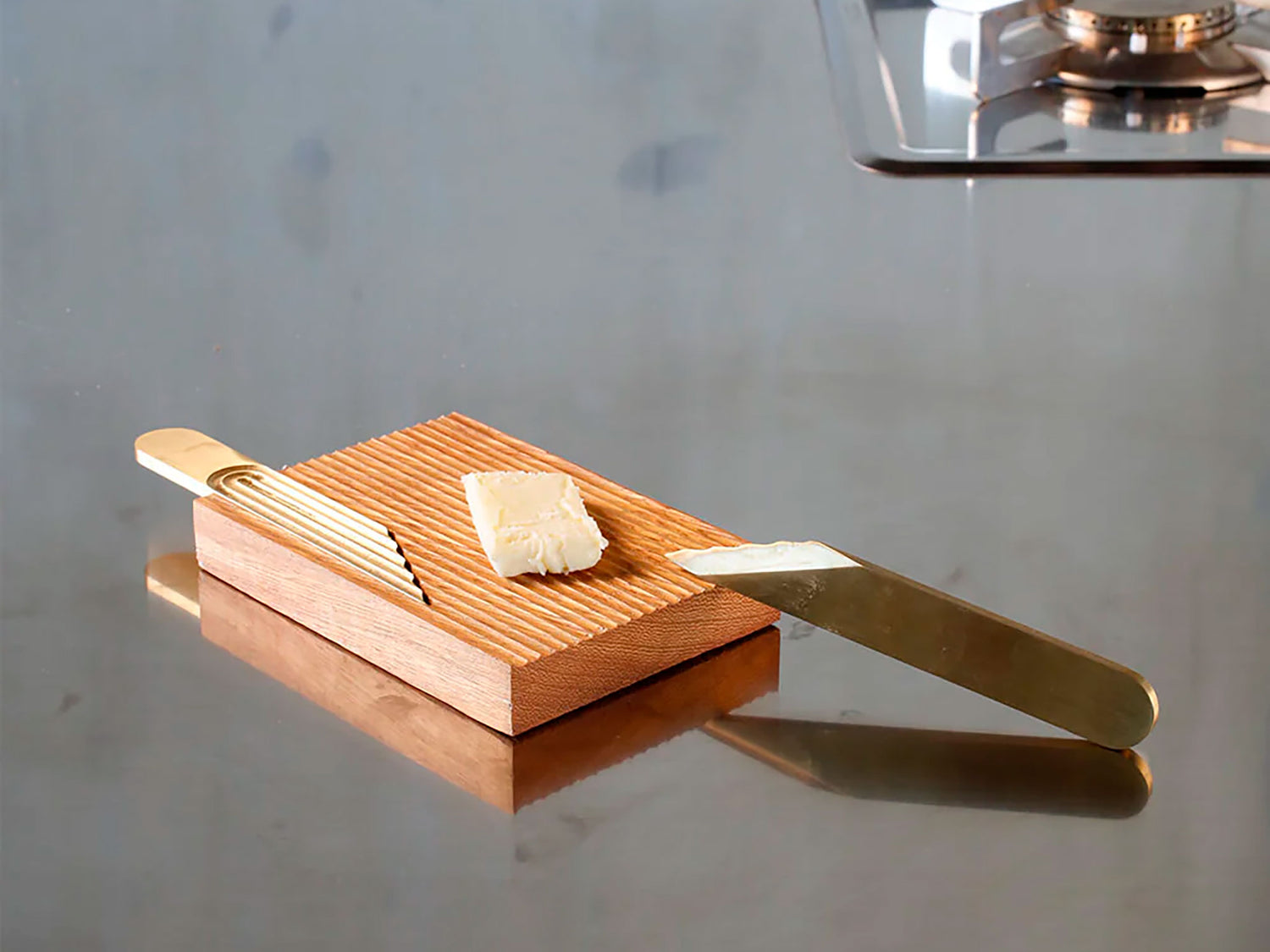 The wood tool has several carved lines all over the surface. These useful ones are used on the knife to generate a special way to spread butter. There are two versions, one made in brass that comes comes with a Iroko wood pad to put the butter and the other version made in micarta, a special material used for knife handles.