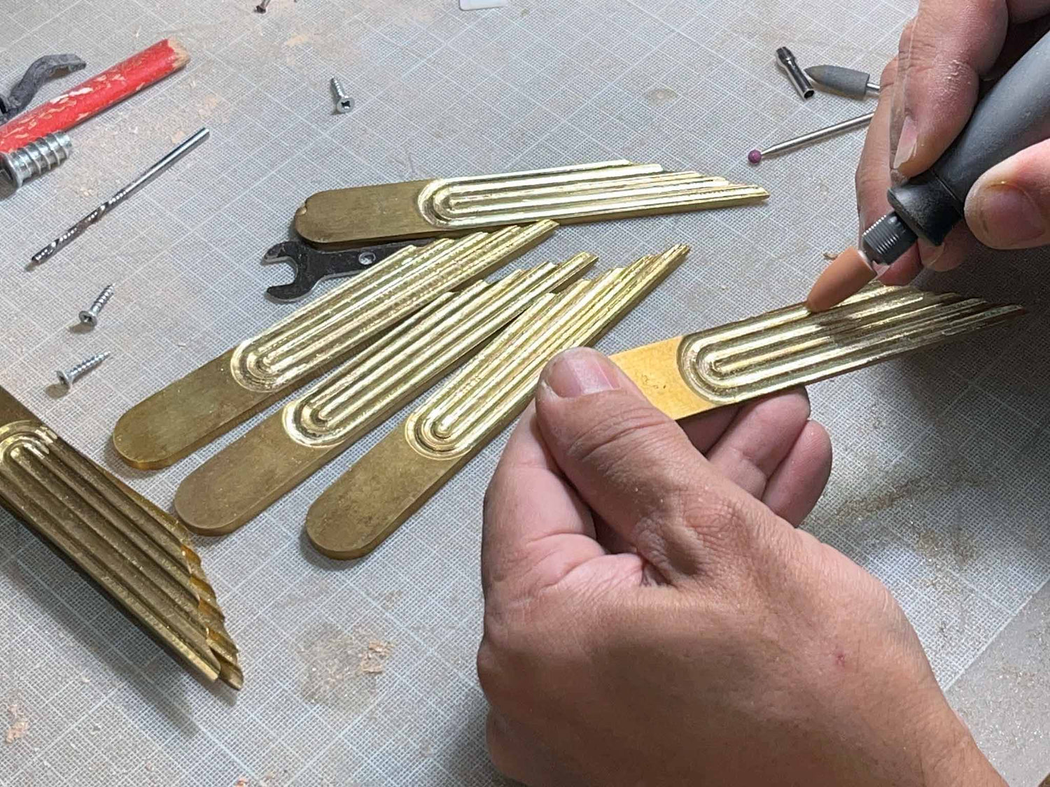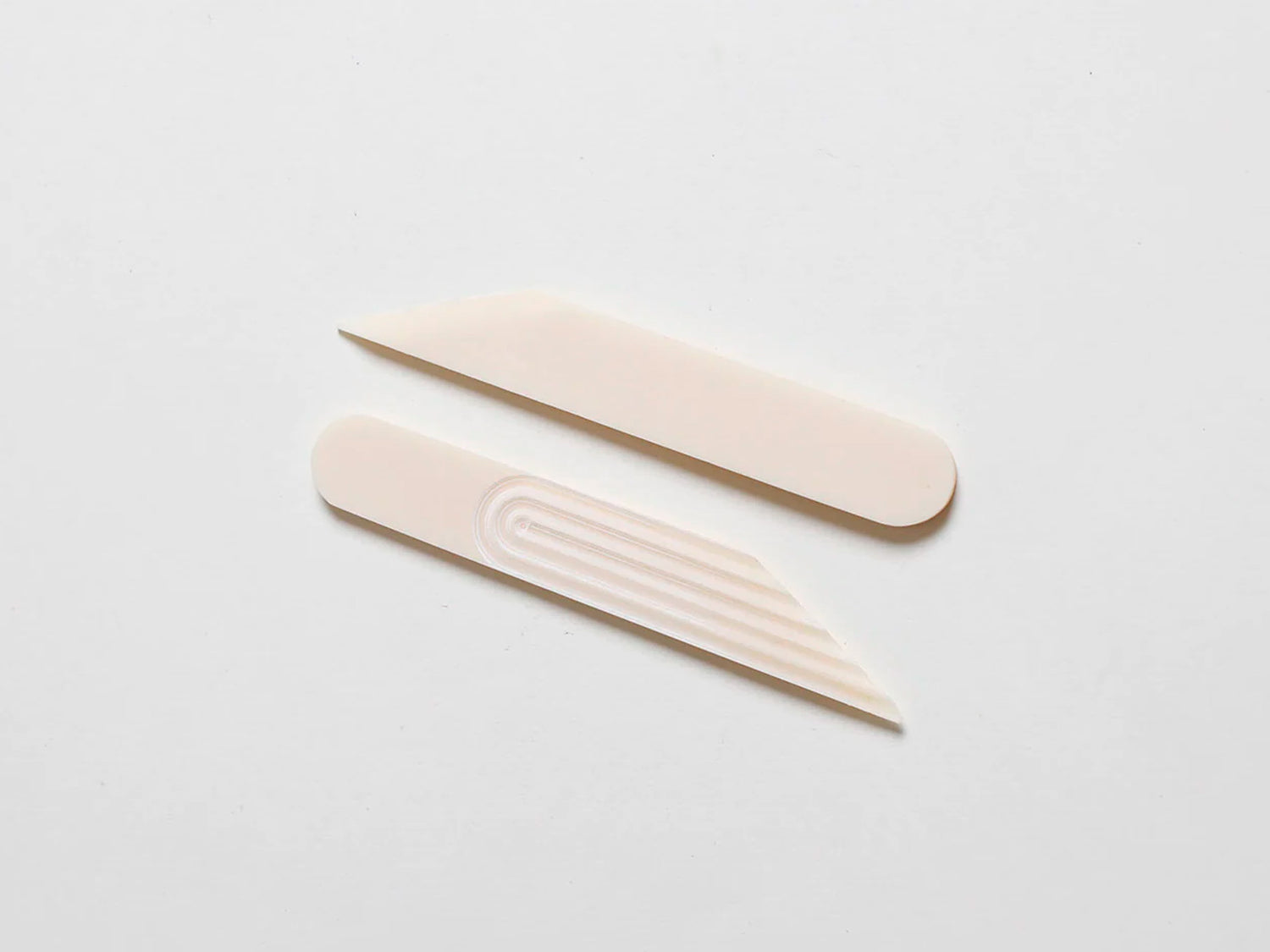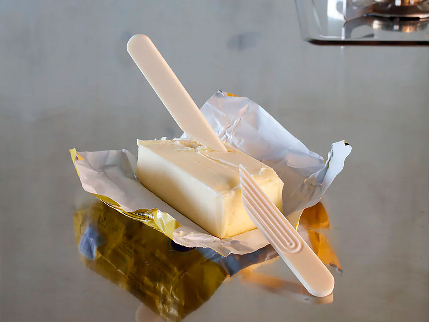 The wood tool has several carved lines all over the surface. These useful ones are used on the knife to generate a special way to spread butter. There are two versions, one made in brass that comes comes with a Iroko wood pad to put the butter and the other version made in micarta, a special material used for knife handles.